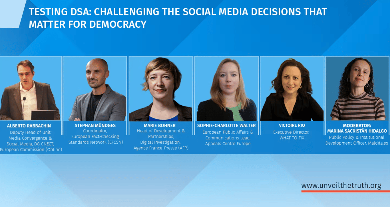 WHAT TO FIX is excited to join colleagues from the European Commission, EFCSN, AFP, The Appeal Center Europe and Maldita to discuss the DSA and its impact in challenging social media decisions that matter for democracy